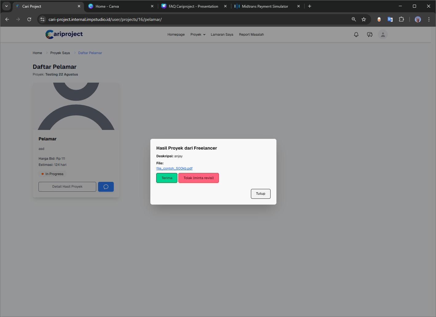 - Tombol Tolak ---> status revisi diminta, kembali ke freelancer