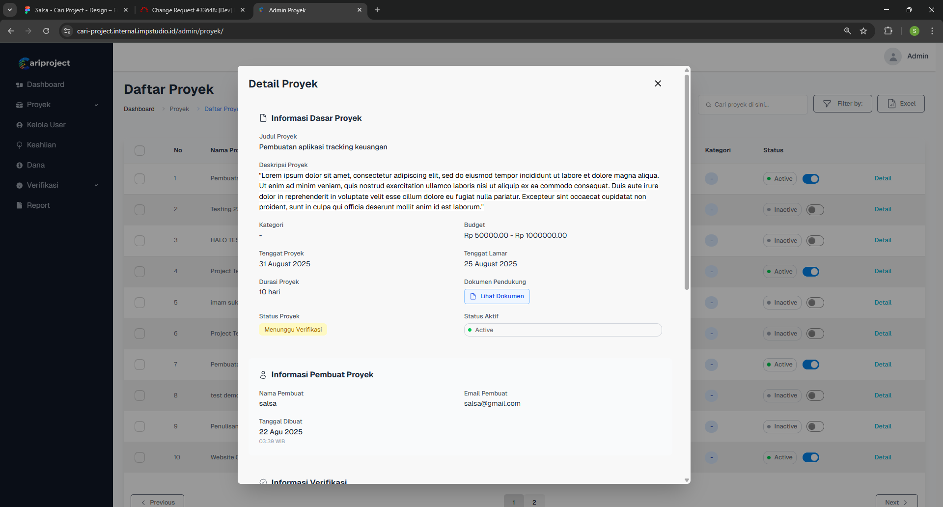 - yang diubah = ( proyek/daftar proyek/detail - verifikasi proyek/detail)