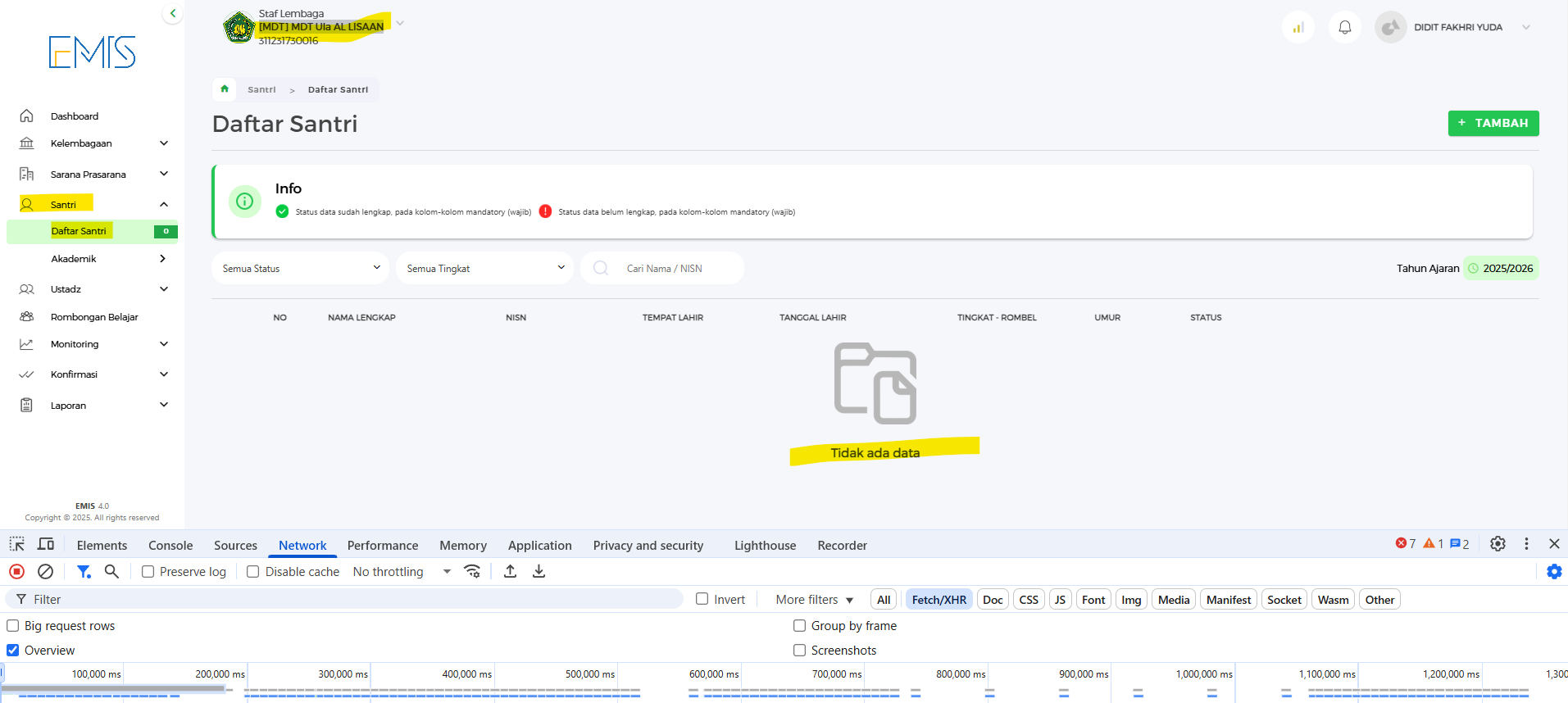 Mohon bantuan pengechekannya data santri lembaga [MDT] MDT Ula AL LISAAN Kosong