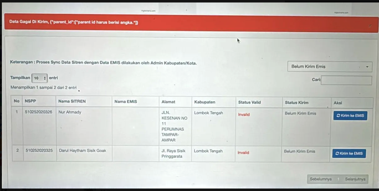 Tidak bisa sync data lembaga antara sitren dan EMIS karena error 'parent_id harus berisi angka'