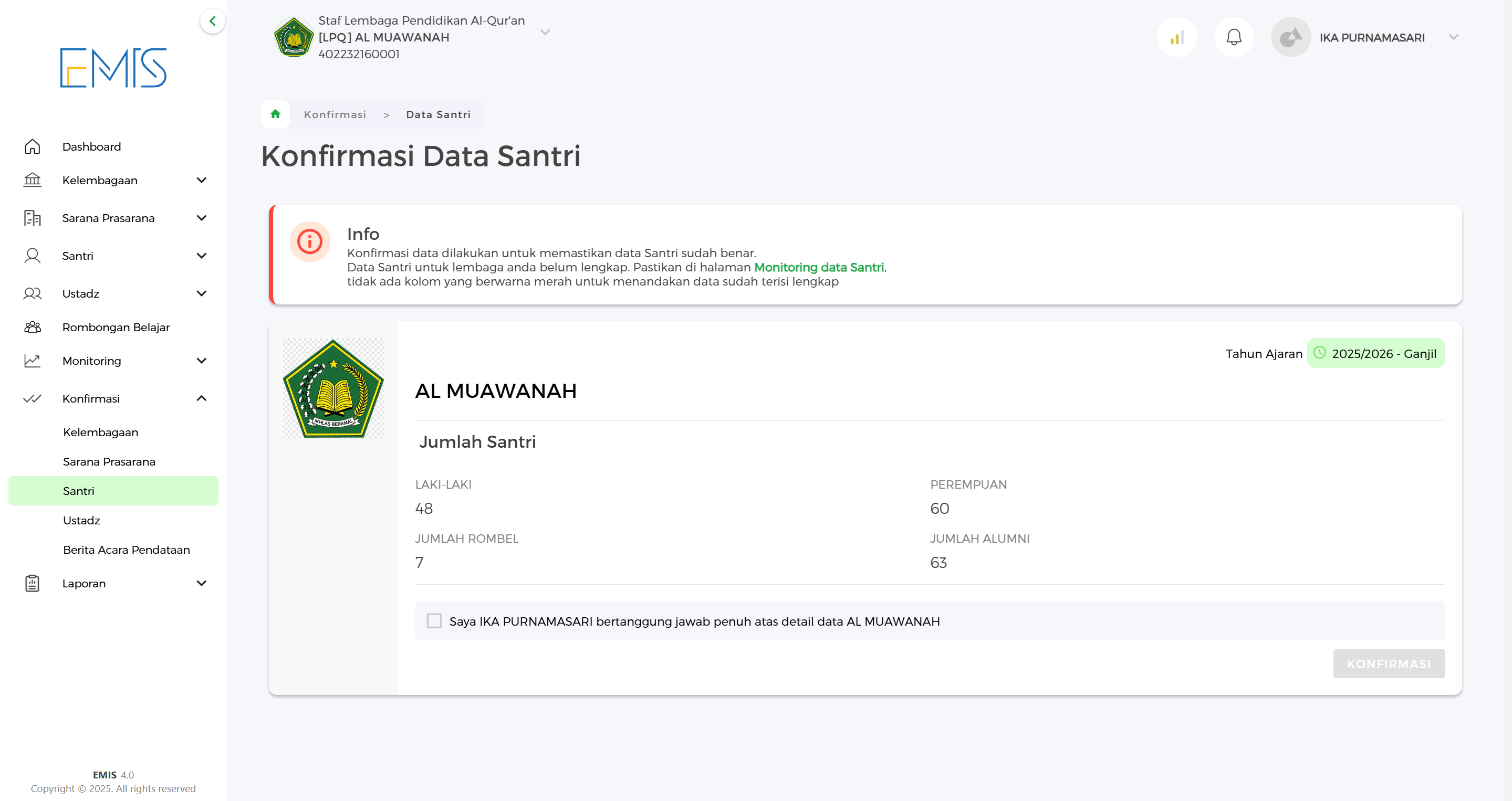 Konfirmasi santri : Laki 48 , Perempuan 60