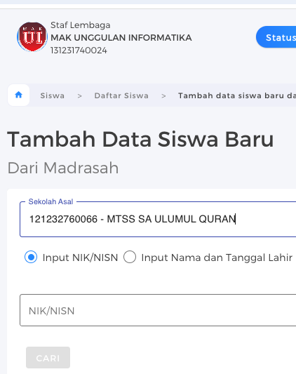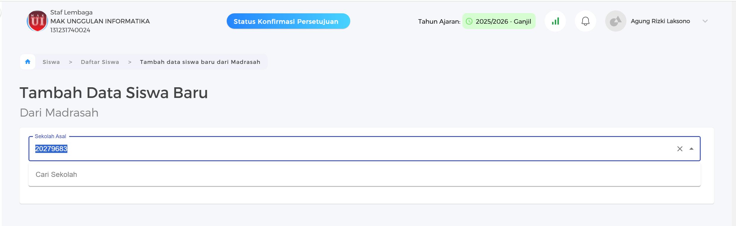 1. Menu Siswa -> daftar siswa -> tombol tambah -> dari madrasah
