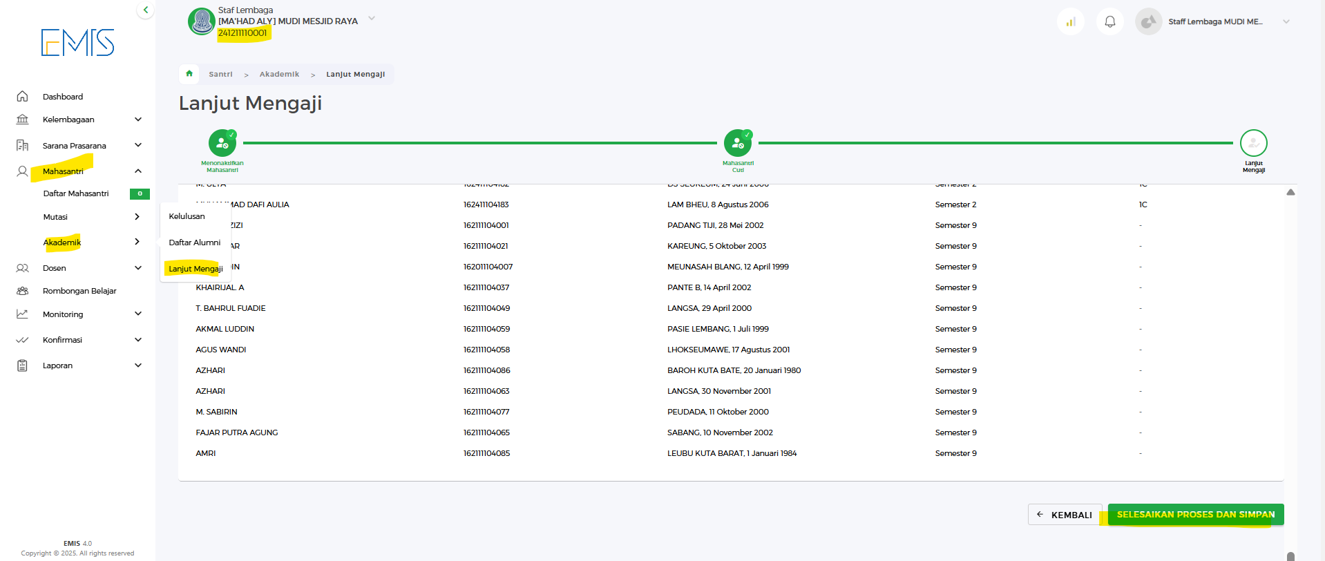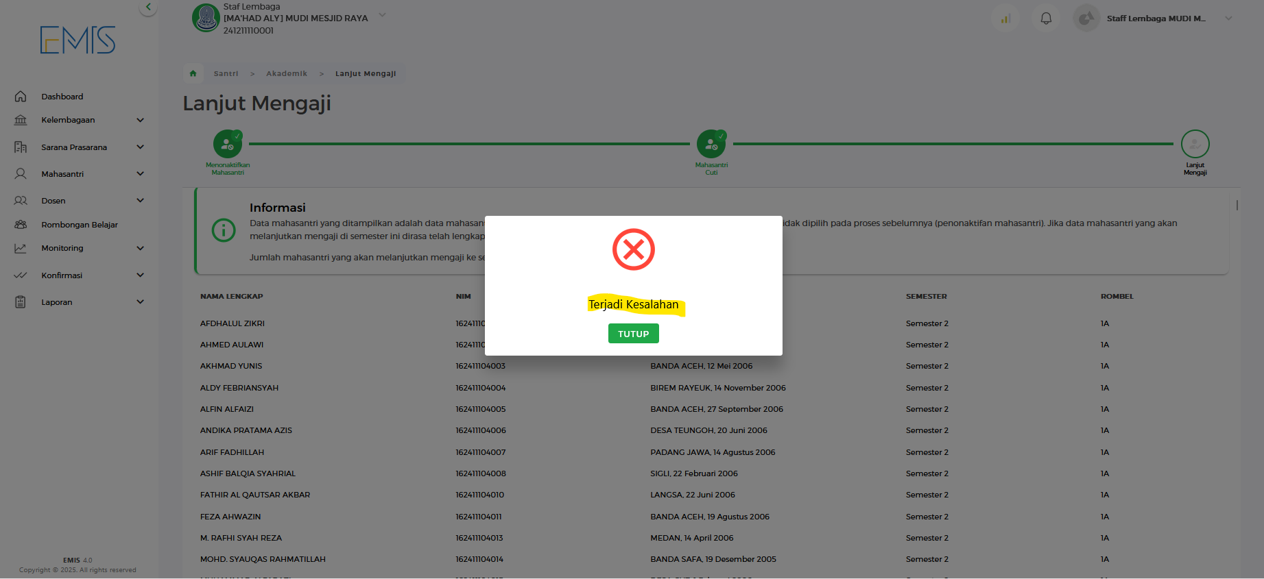 Mohon bantuannya terkait lembaga [MA'HAD ALY] MUDI MESJID RAYA tidak bisa proses lanjut mengaji dengan notif terjadi kesalahan